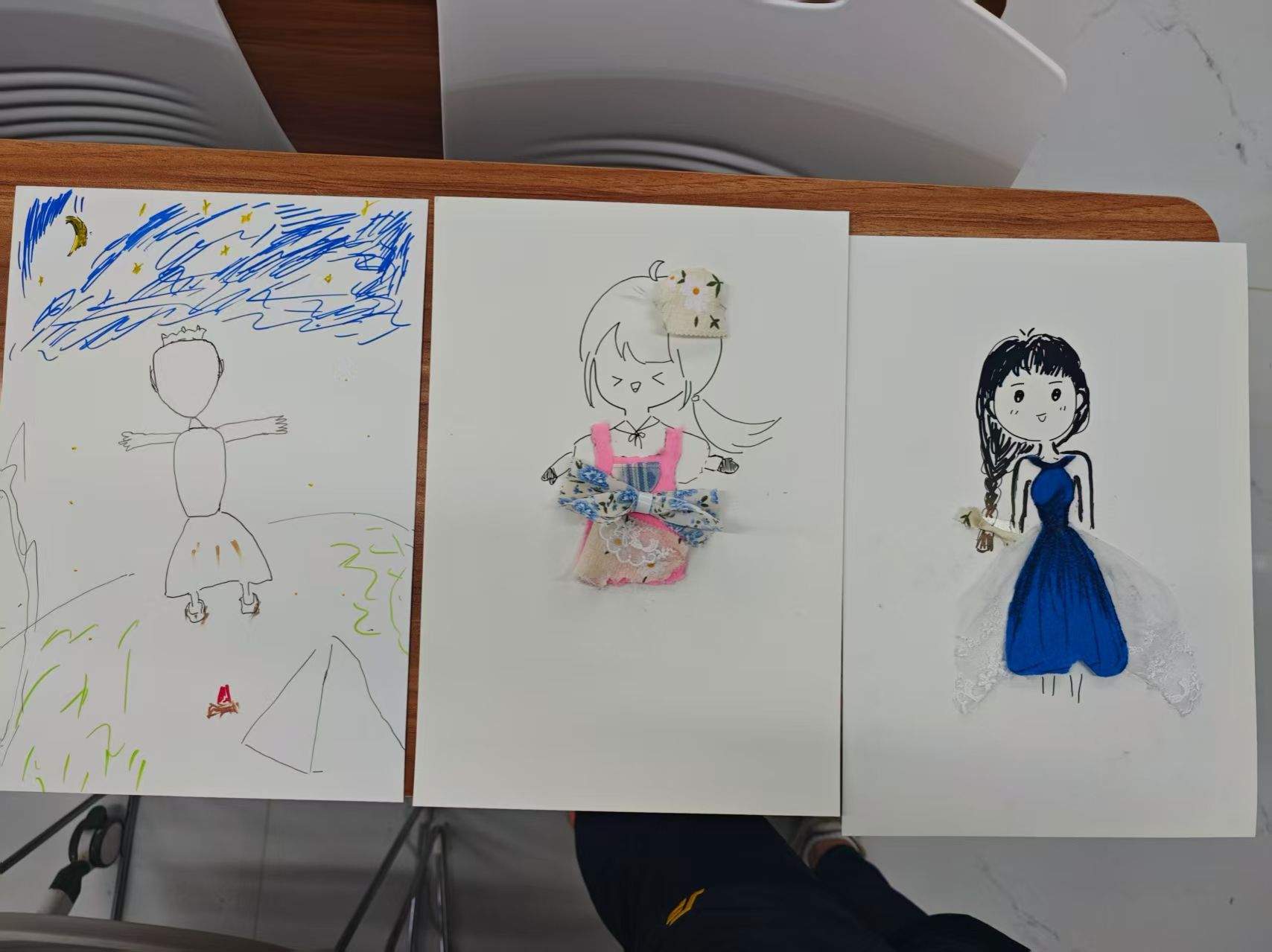 在自我探索与创作环节,同学们先为自己选定的角色赋予专属形容词,并在小组内交流分享;随后盲抽OH卡,结合卡牌意象重新定义贴合内心的形容词;最后以绘画、图片粘贴等形式,创作专属自我形象,将抽象的情绪与感受转化为具象的作品表达。