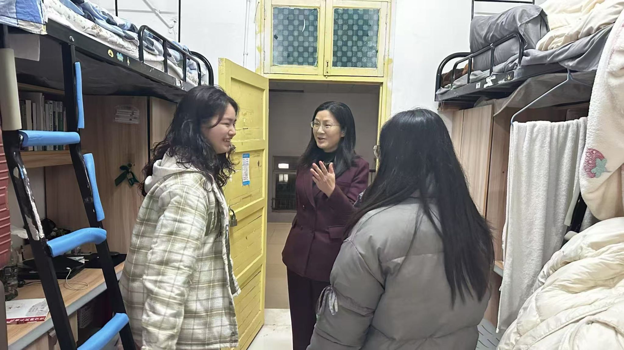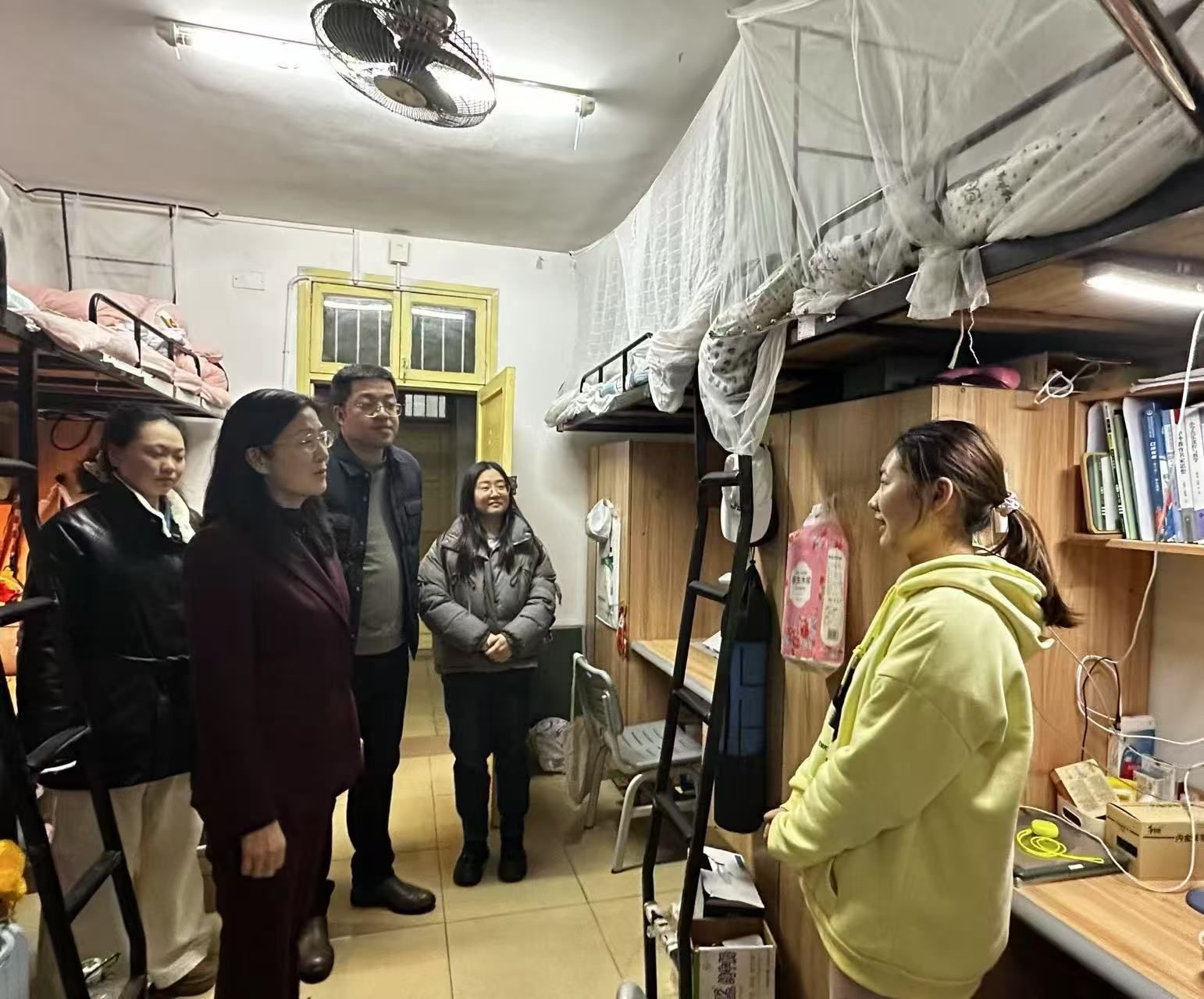 3月11日晚,学校党委委员、副校长蒋蓉在学生工作部副部长禹晗以及辅导员罗西的陪同下,深入一站式学生社区学生公寓和晚自习教室进行了细致的走访。蒋校长逐一查看了同学们的宿舍环境和学习条件,详细了解他们的日常生活和学习情况。在走访过程中,蒋校长特别提醒同学们要注意节能省电,共同营造一个绿色环保的生活环境。同时,她还特别关注了混寝学生的适应状况。每到一处,蒋校长都与同学们展开亲切交谈,耐心倾听他们的需求和困难,并给予积极的回应和建议。蒋校长对同学们展现出的良好精神风貌和积极的学习态度给予了高度评价,她勉励大家要继续保持这种积极向上的态势,不断提升自我。