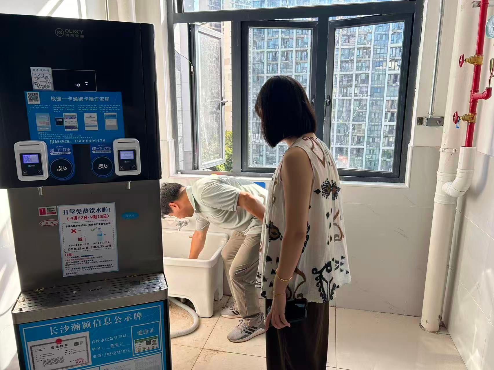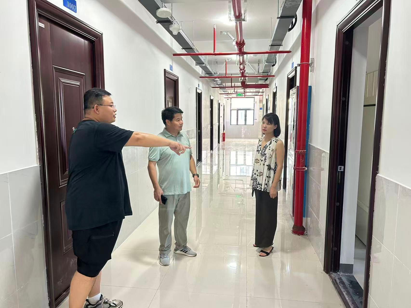 在学生寝室,周校长仔细查看了寝室内部卫生状况,对卫生整洁的寝室给予肯定,同时也对部分存在卫生死角的寝室提出整改建议,叮嘱同学们要养成良好的生活习惯,共同营造干净、舒适的居住环境。随后,周校长一行来到宿舍走廊,重点检查了两侧洗手池的清洁情况与饮水机的设施完好度。走出宿舍楼,一行人来到楼栋外的新生报到点,周校长与陈书记详细同学生志愿者沟通了解报到点的布置情况,包括流程指引牌设置、新生资料领取处安排、志愿者服务岗位分布等,强调要优化报到流程,为新生及家长提供更便捷、贴心的服务,让大家切实感受到红色之一师、品质之一师、活力之一师、幸福之一师!
