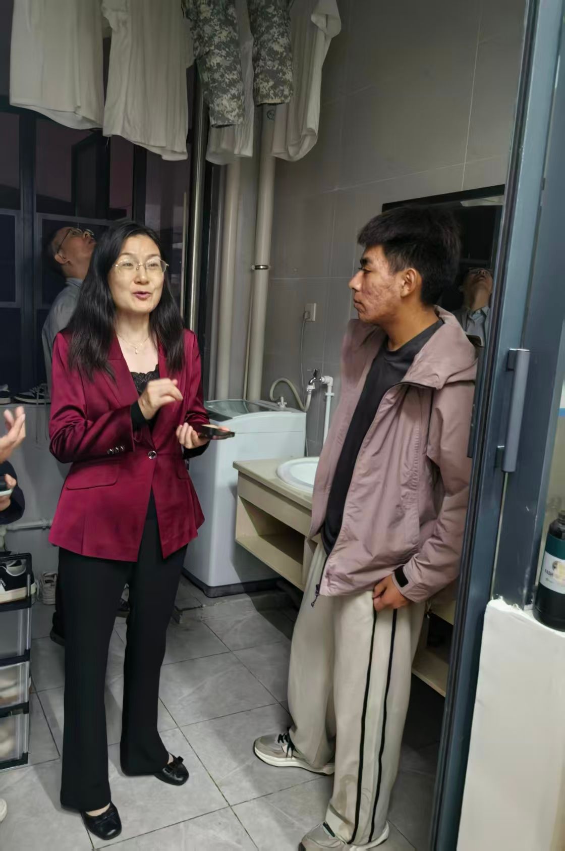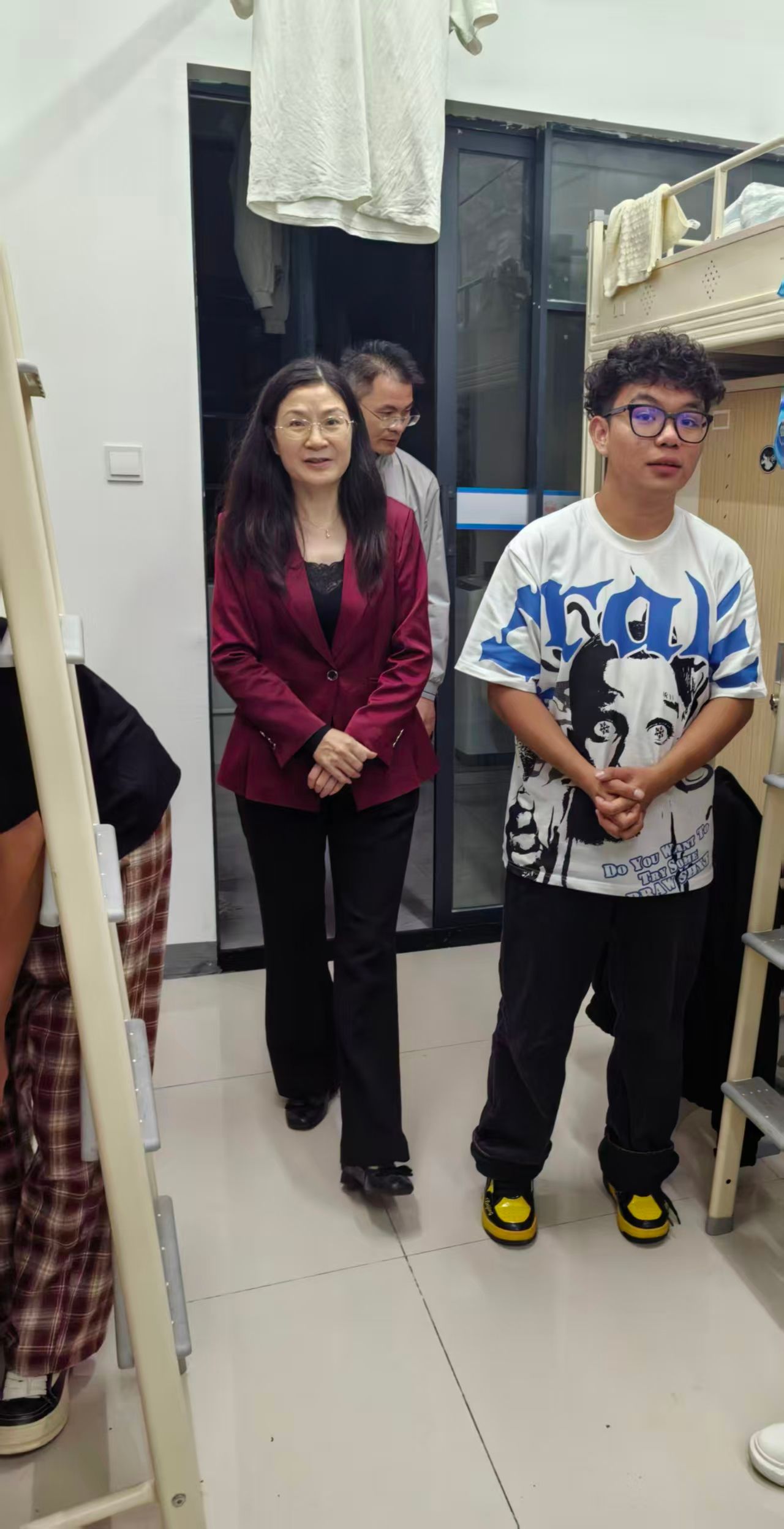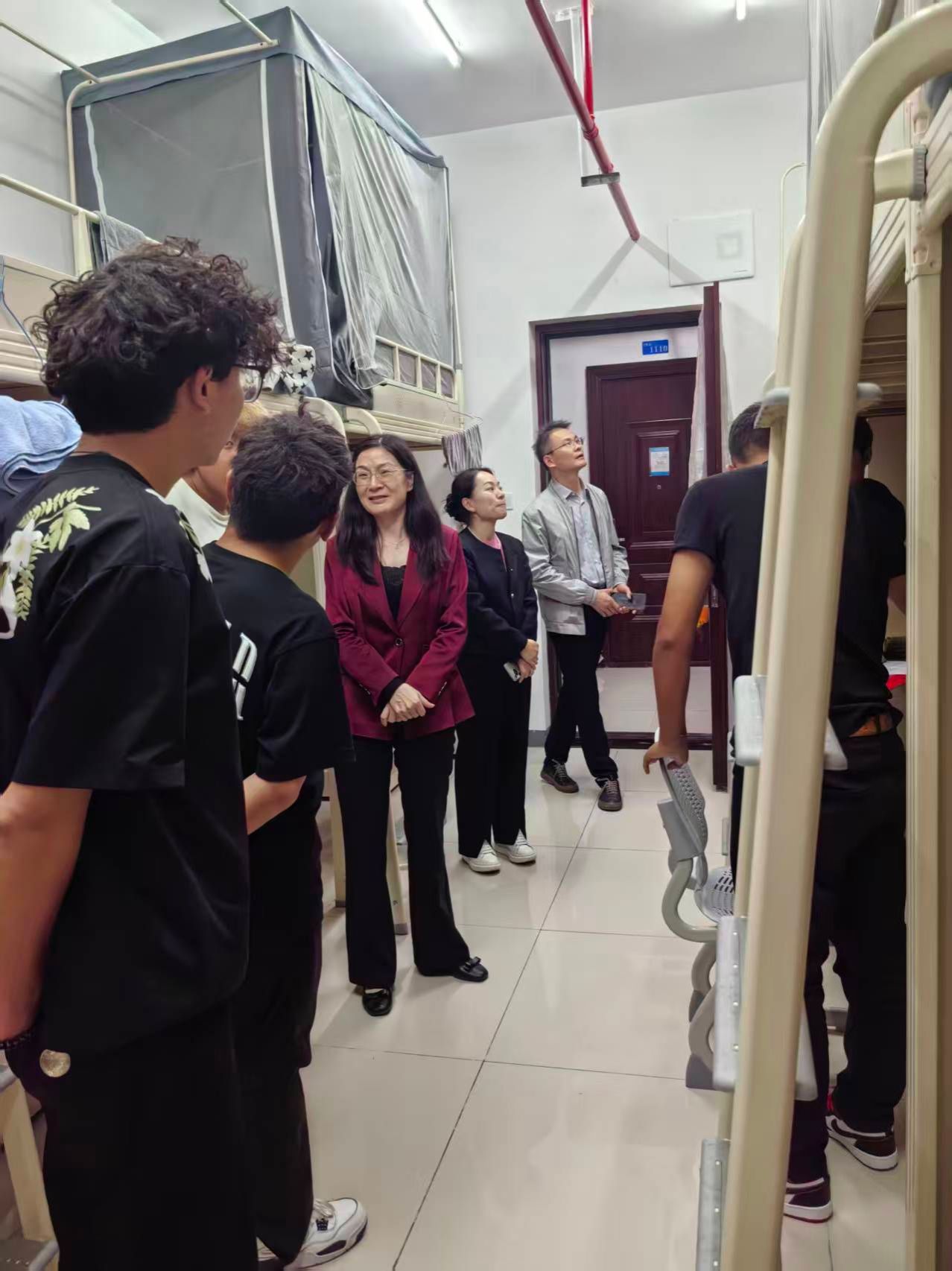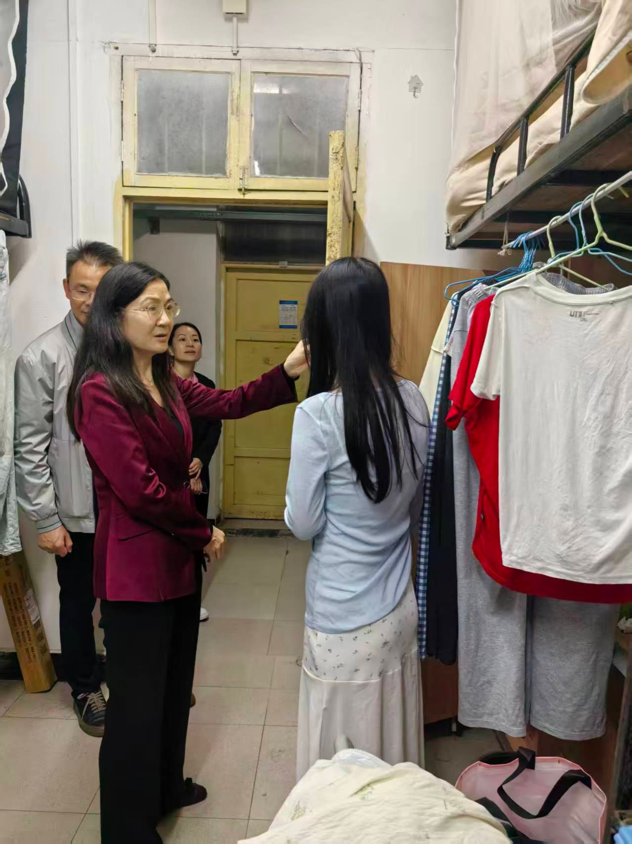 在19栋宿舍,蒋校长与宿管值班人员亲切交谈,感谢他们的辛勤付出,并希望他们在日常工作中继续注重引导节约用电、保持公共区域整洁,共同营造环保、舒适、和谐的校园环境。