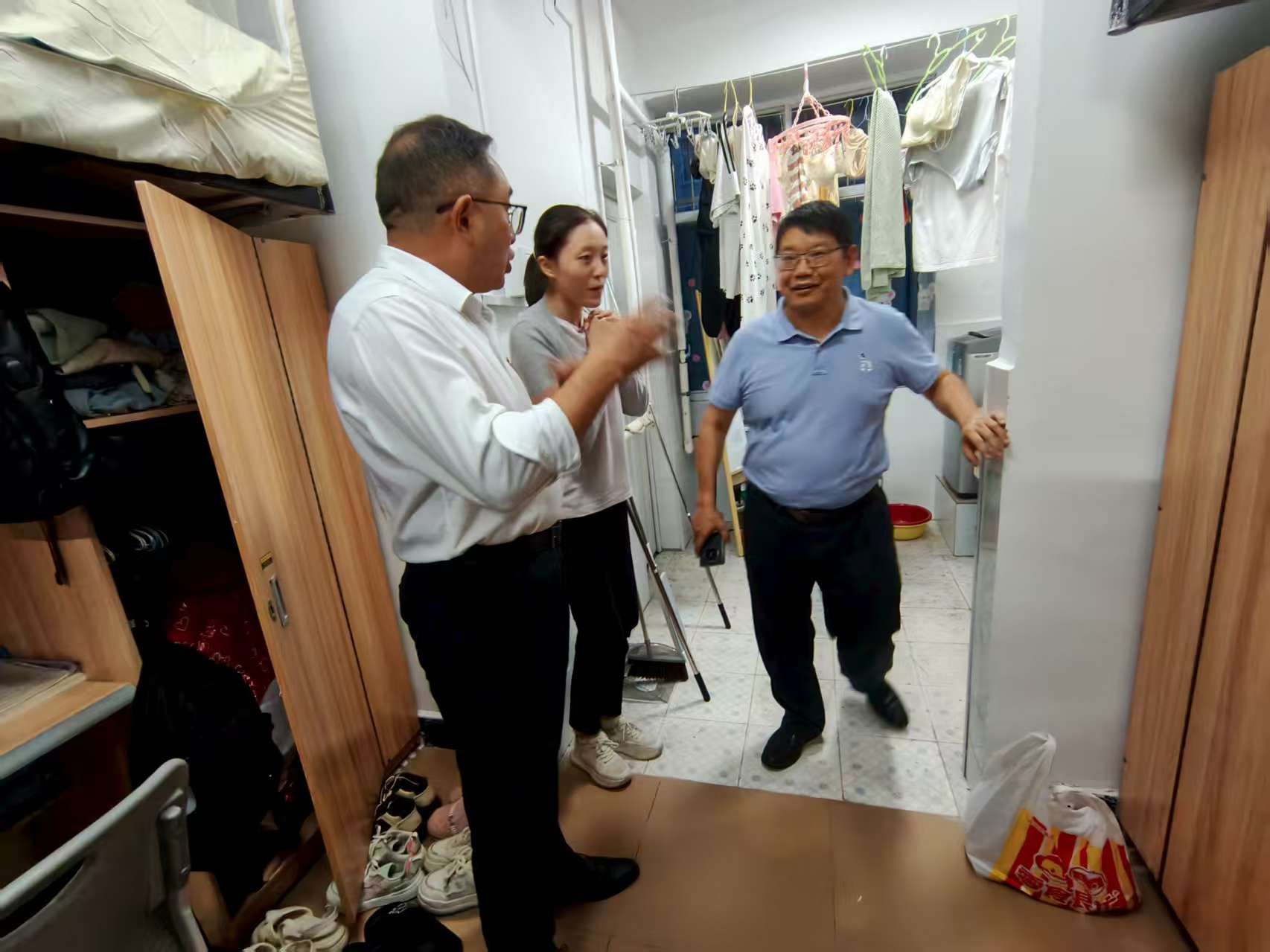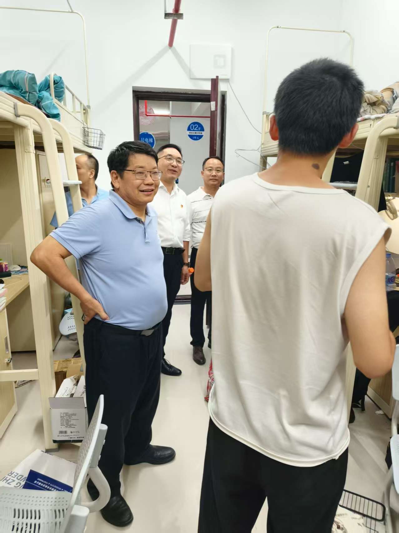 9月8日晚,校党委书记罗成翼深入学生公寓开展实地调研,详细了解暑期寝室翻新成效与新生入住情况。学生工作部部长周大庆,副部长李翔、付焱,公寓管理科科长旷怡陪同调研。一行首先前往学思苑11-14栋,重点检查今年暑假期间寝室翻新改造项目的完成质量与实际使用情况,实地查看了宿舍内基础设施更新、环境优化等关键改造内容。随后,来到新建的唯实苑3栋,与刚搬入的学生亲切交流,仔细问询同学们的学习规划、生活适应情况及对住宿环境的意见建议。